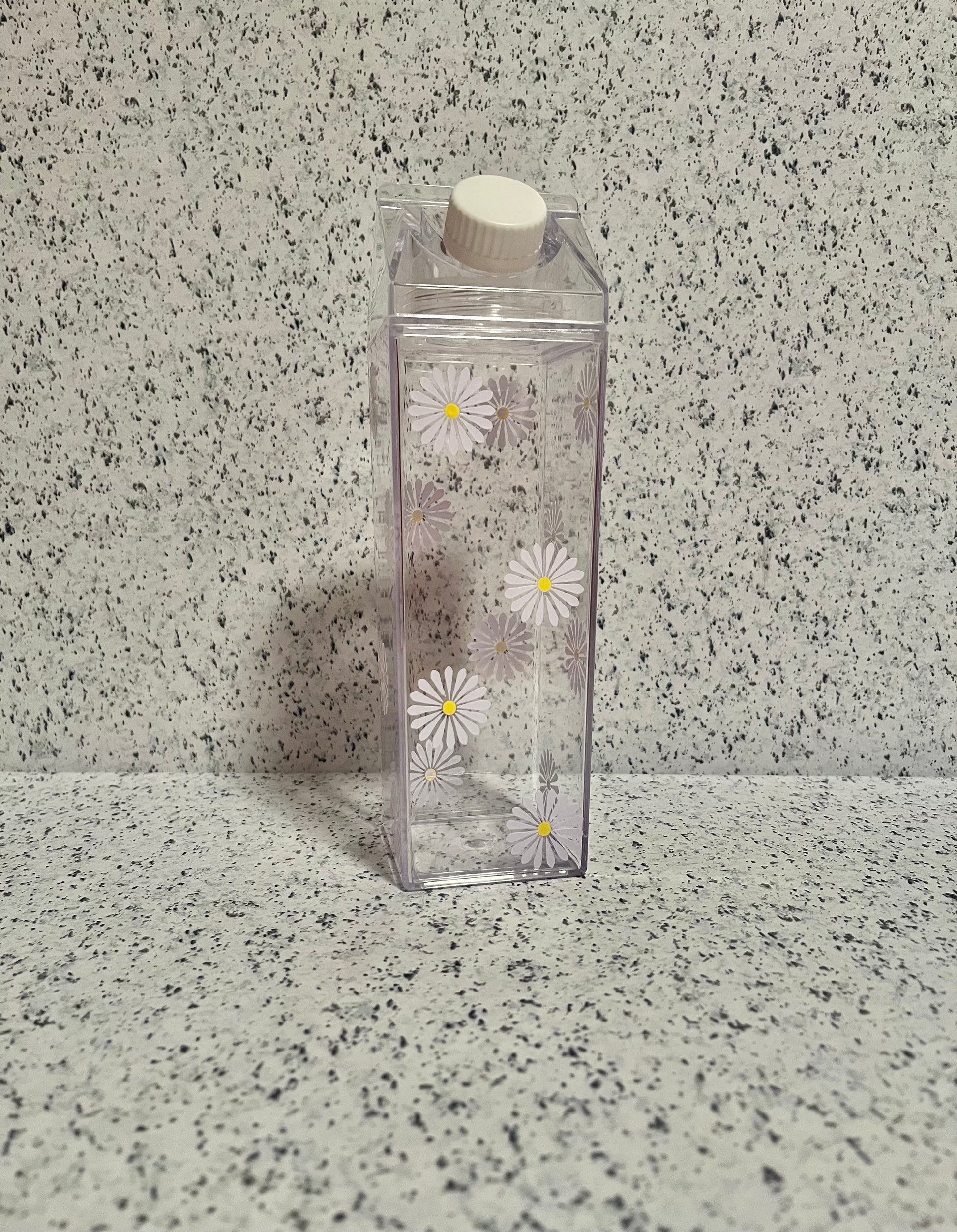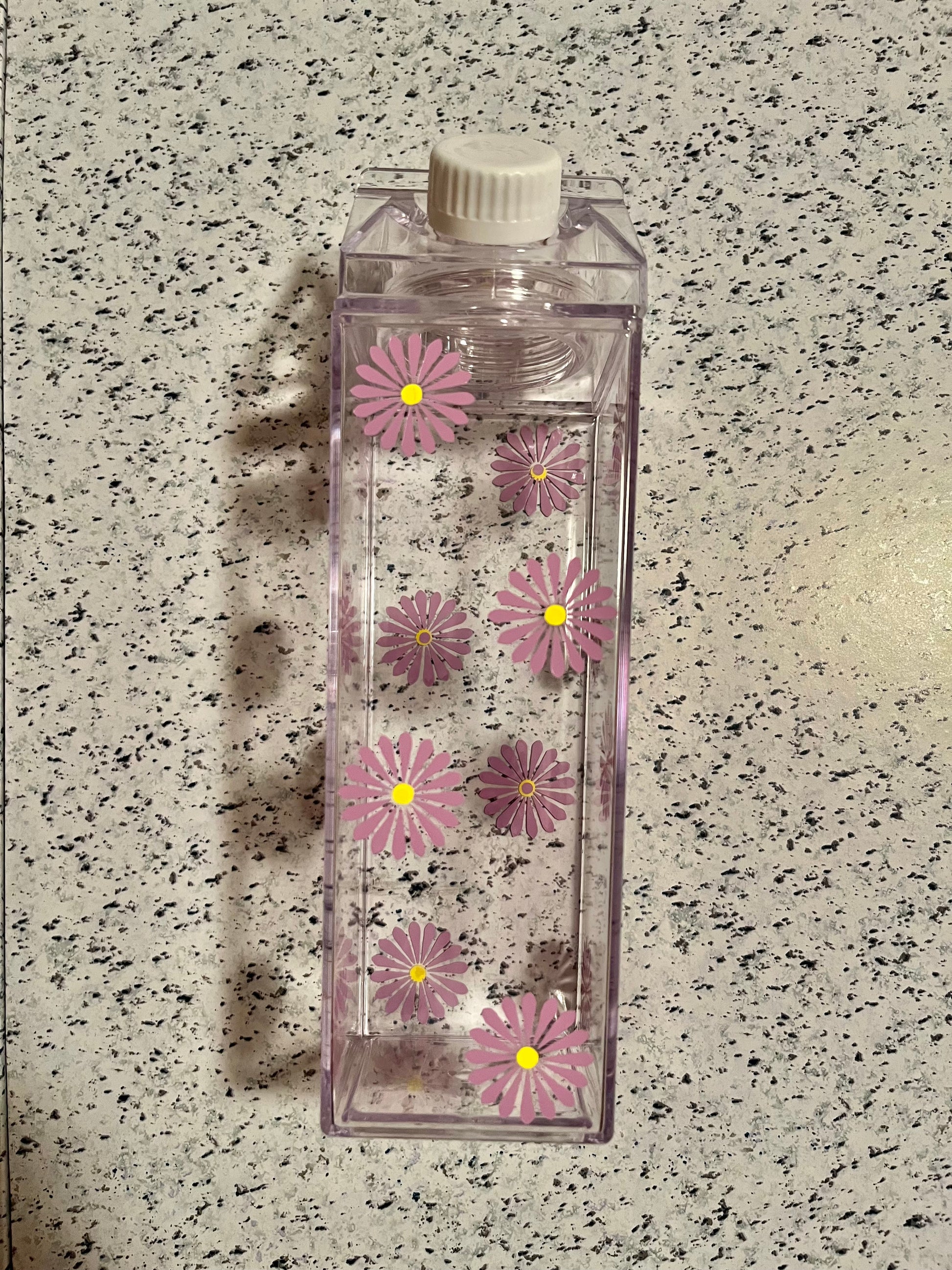 Introducing the Daisy Milk Carton Water Bottle, the perfect combination of trendiness and functionality. This unique water bottle takes inspiration from the classic milk carton design, giving it a stylish twist. Made from durable materials, it is perfect for your on-the-go hydration needs. Stay hydrated in style with the Daisy Milk Carton Water Bottle.